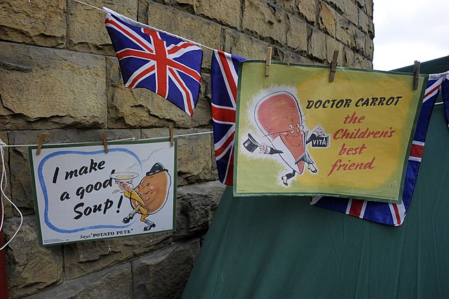 During the Second World War years there was a critical need for Britain to find ways to be self-sufficient in terms of food. With enemy blockades around our shores many of the goods that were usually imported were unable to reach us. By January 1941 the usual food supply coming from overseas had fallen by half. The Lend Lease system helped, with food arriving from the US and Canada. Nevertheless it was still necessary to introduce food rationing. Advice centres were set up throughout the country showing people how to make the best of the little that was available. With the scarcity of imported wheat, bread became more of a luxury, with ‘Potato Pete’ encouraging people to eat more potatoes, a foodstuff that could be locally grown.